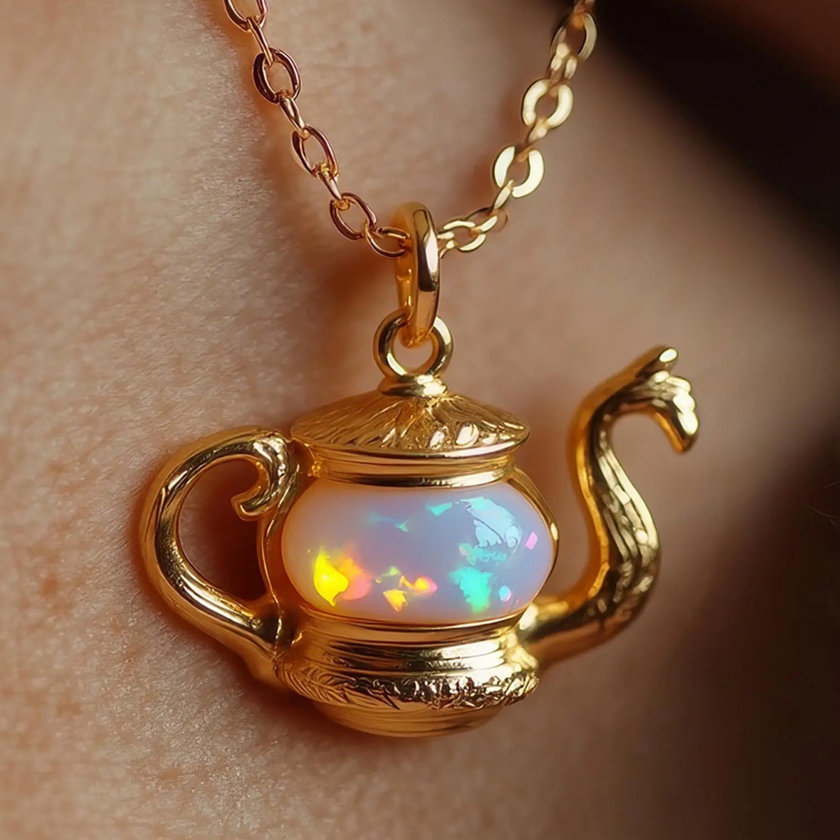 Opal Natural Stone Pendant Necklace Aladdin's Magic Lamp European and American Retro Jewelry Sparkling Teapot Necklace