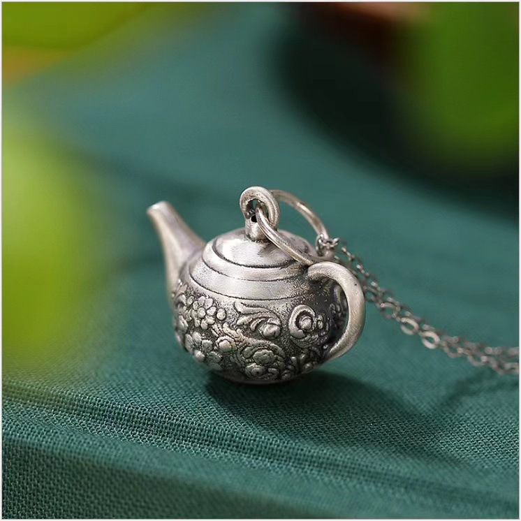 Vintage Old Teapot Embossed Pattern Pendant Women's Distinctive Water Bottle Exquisite Necklace Simple Fashion Pendant Pendant