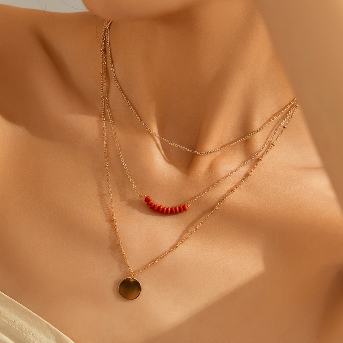 European and American fashion summer beach wind natural coral stone smooth texture round pendant multi-layered stacked necklace women