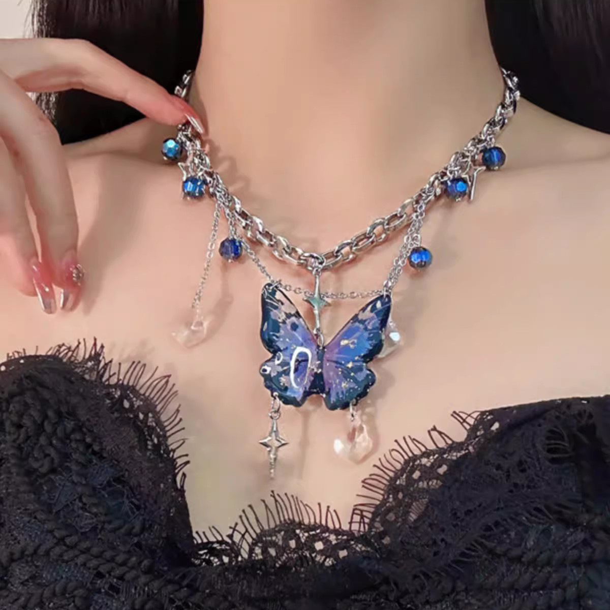 Blue Tassel Butterfly Necklace Women's Light Luxury Niche High-end Clavicle Chain 2024 New All-match Subculture Necklace Chain