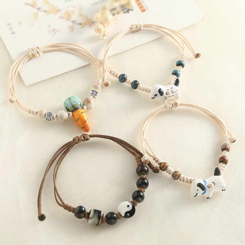 Chinese-Style Cultural and Creative Jingdezhen Ceramic Bracelet Hand-Painted Radish Bagua Dog Porcelain Bead Bracelet Niche Versatile Cartoon Jewelry