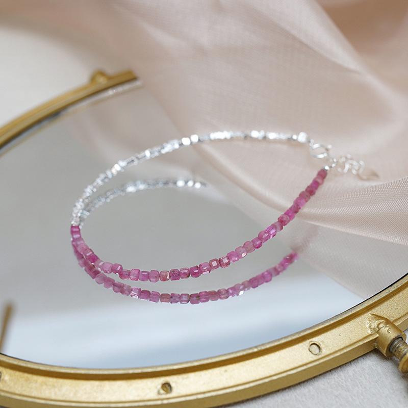 Sweet Girly Elegant Sugar Cube Pink Tourmaline Broken Silver Bracelet 925 Sterling Silver Slim Stacked Bracelet Gift 50457