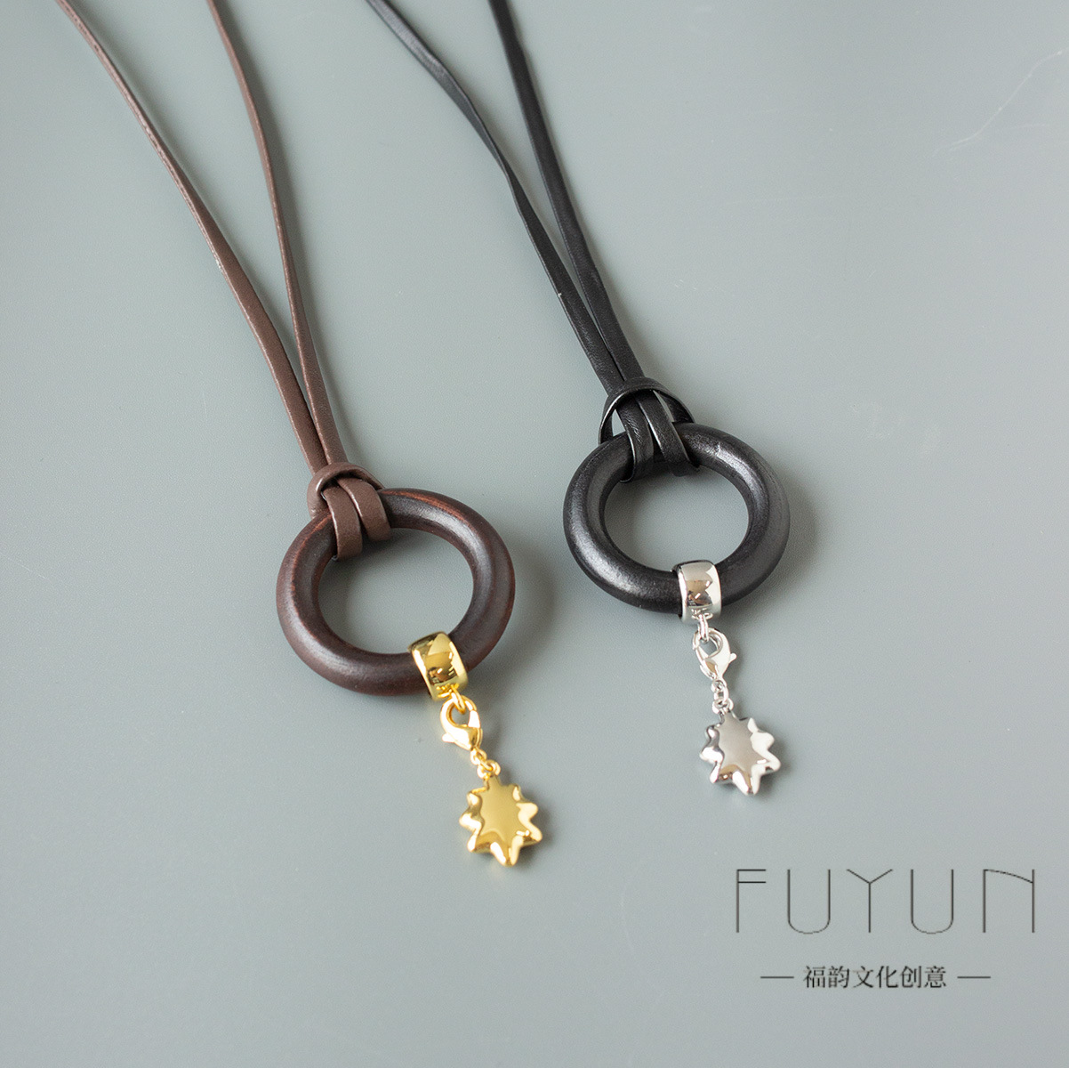 Aima * New Chinese Long Leather Rope Wooden Necklace New Adjustable All-match Ring Gold and Silver Meteor Woolen Chain