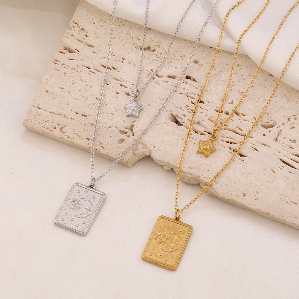 Fashionable and Simple Stainless Steel Star Sun Square Pendant Necklace, Versatile Double-Layer Necklace, Collarbone Chain for Women