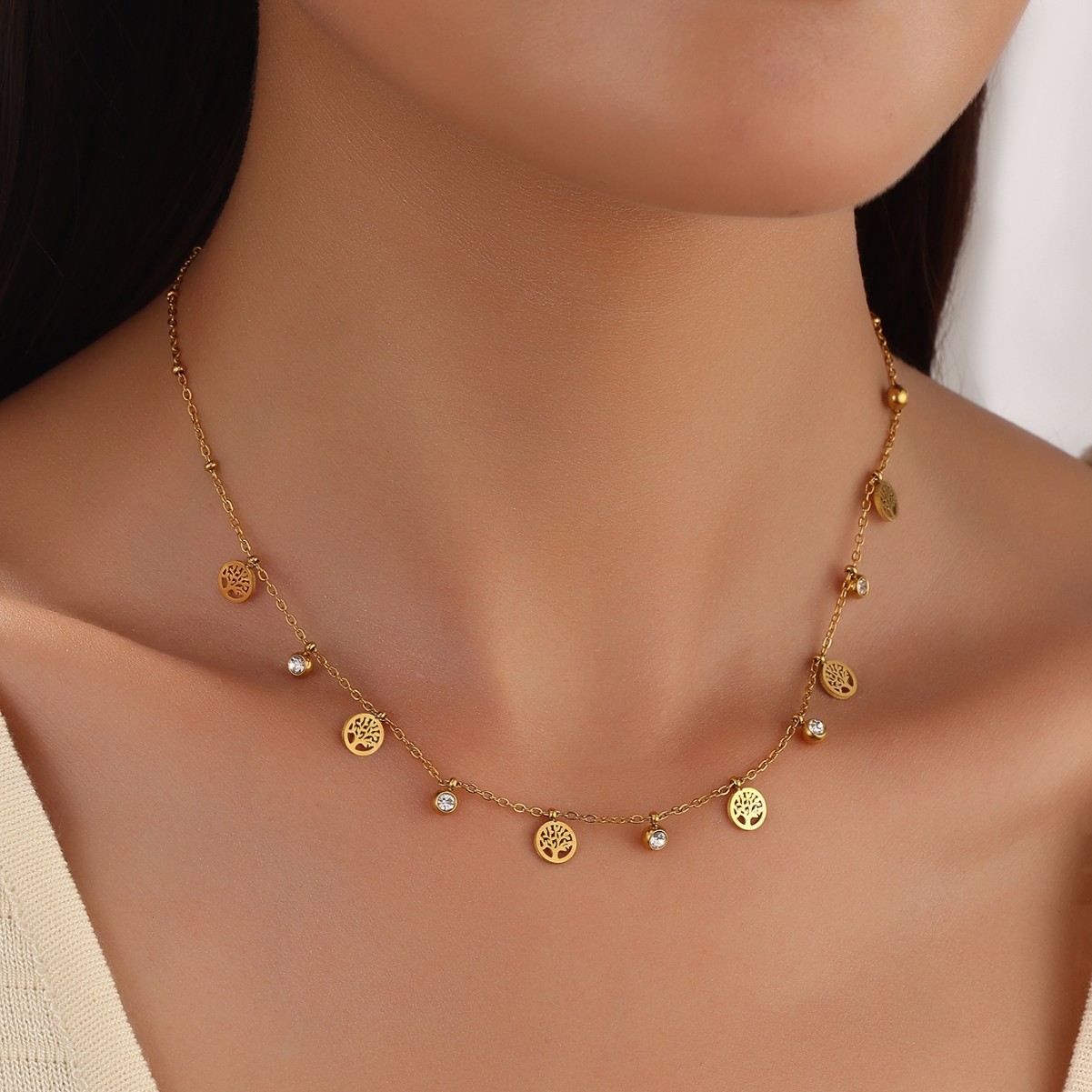 Temperament Stainless Steel Necklace for Women, Non-Fading, High-End, Accessible Luxury Diamond Life Tree Tassel Pendant, Clavicle Chain Jewelry