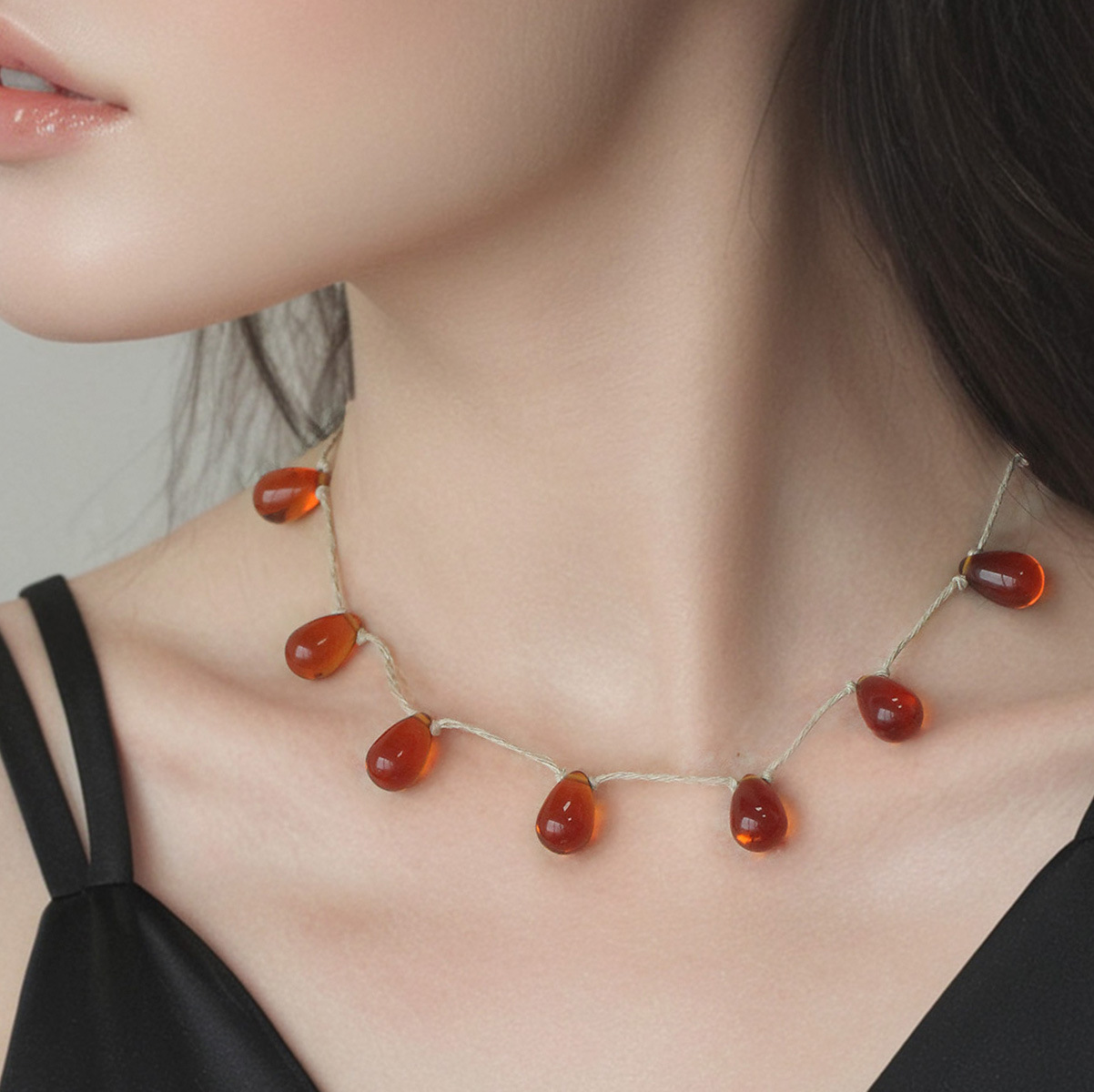 European and American Temperament Hemp Rope Drop Necklace New Chinese Style Simple Creative Daily All-match Garnet Beaded Clavicle Chain