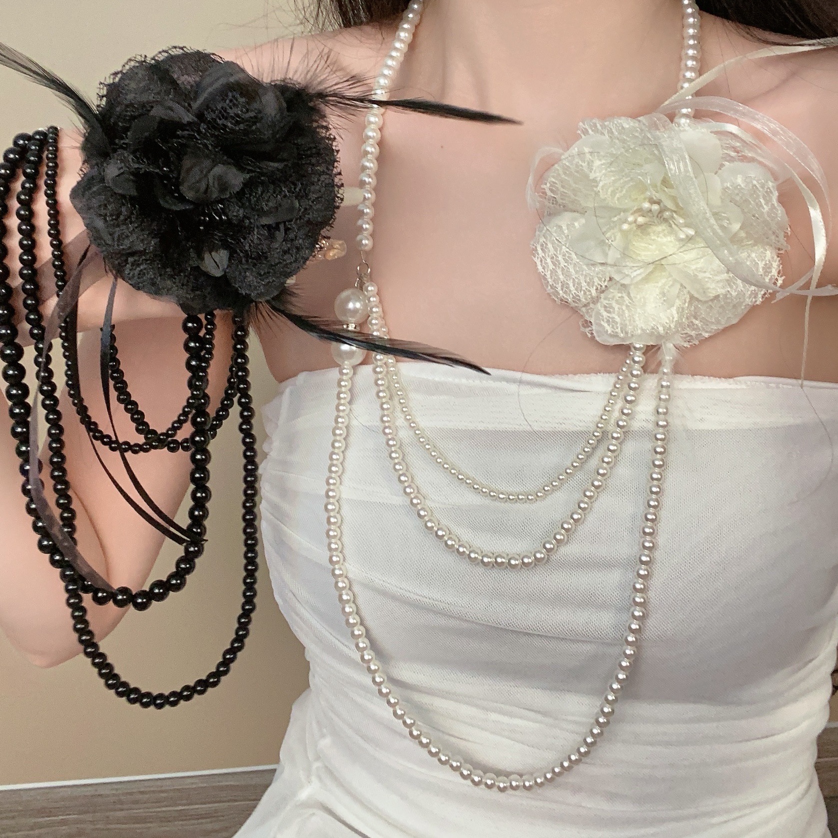Y2K Ancient Atmosphere Flower Imitation Pearl Necklace Lace Flower Long Beaded Stacked Necklace Subculture Jewelry