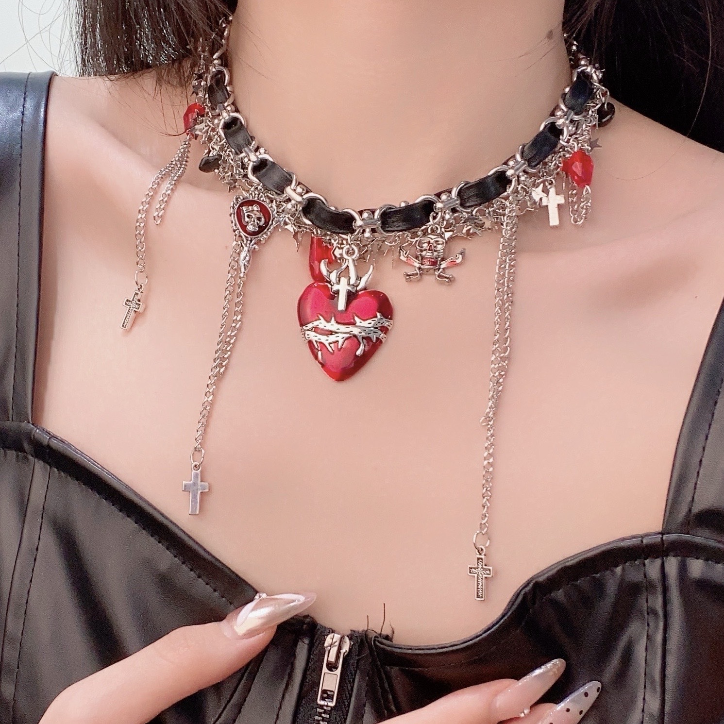 Imprisoned Thorns Red Love Star Tassel Cross Necklace y2k Subculture Leather Multi-layer Clavicle Chain Tide