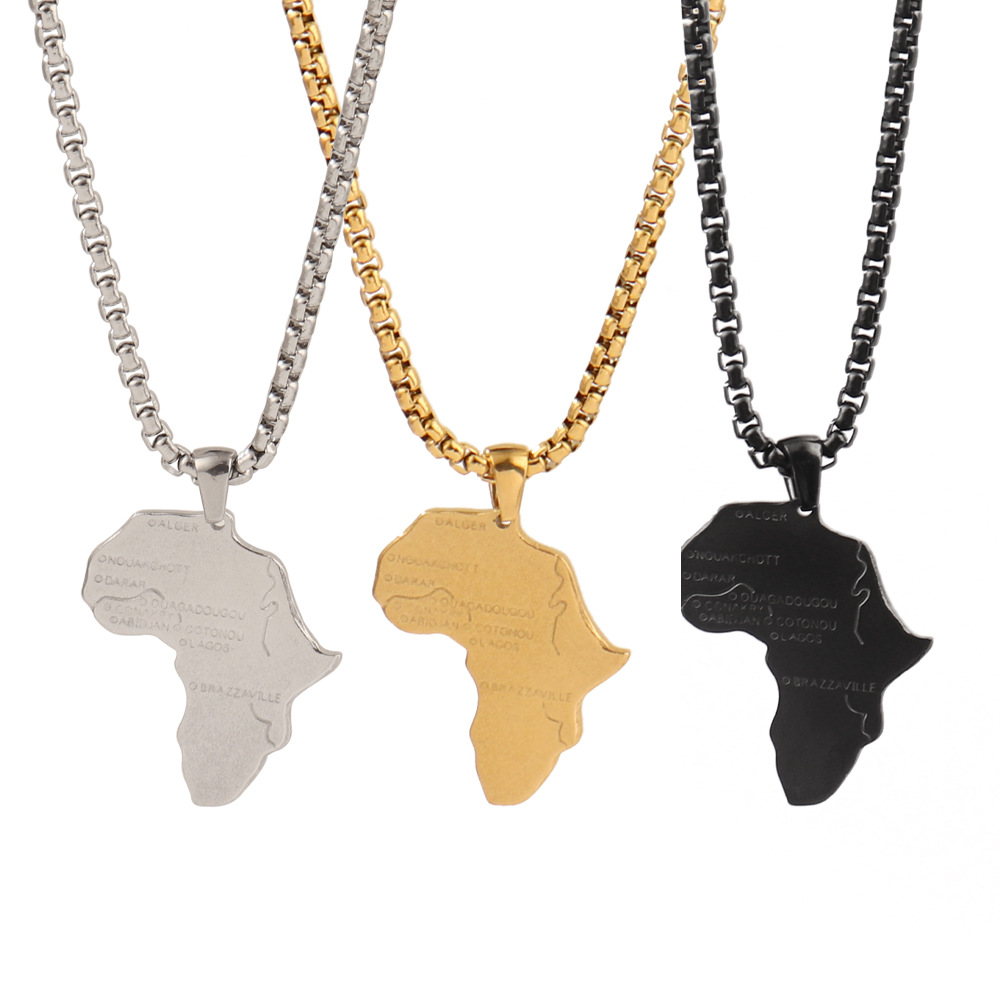 European and American Fashion Stainless Steel Men's African Map Pendant Necklace Non-Fading Personalized Chain Long Necklace Wholesale
