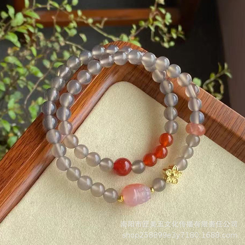 Natural Smoke Gray Agate Salt Source Pixiu Bracelet Handmade DIY Design Double Circle Stacked Bracelet Ready for Sale