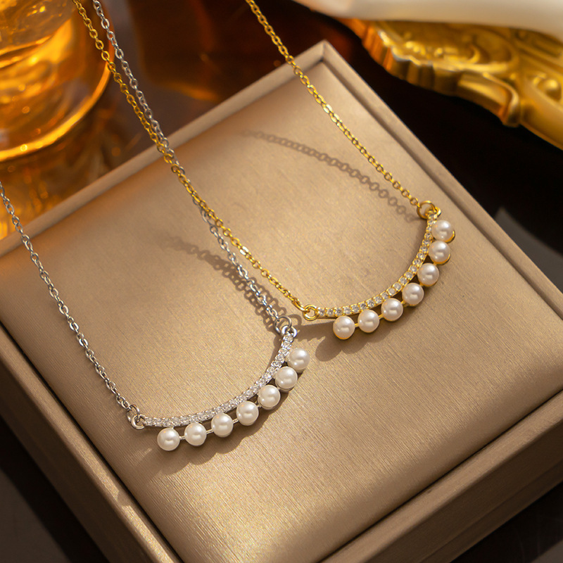 French Ins Style Stainless Steel Necklace Fashionable and Elegant Imitation Pearl Flower Pendant Ot Buckle Clavicle Chain Women's Necklace