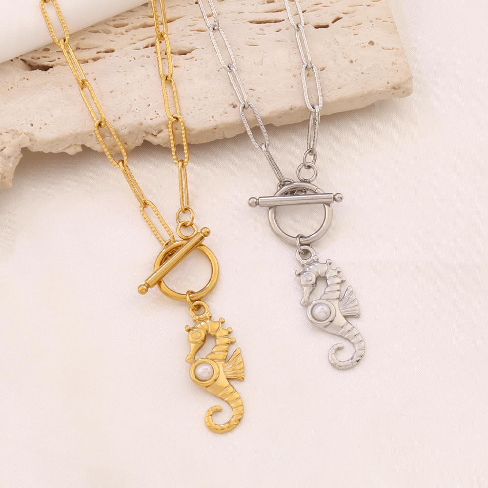 Beach Resort Style Imitation Pearl Seahorse Pendant Necklace for Women 18K Gold-Plated Ins Style Stainless Steel Ot Buckle Clavicle Chain
