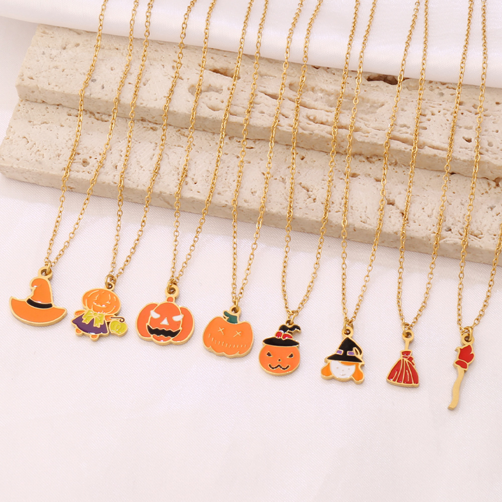 Halloween Colorful Oil Drop Pumpkin Broom Pendant Necklace Personalized Fashion New Stainless Steel Clavicle Chain Women's Jewelry