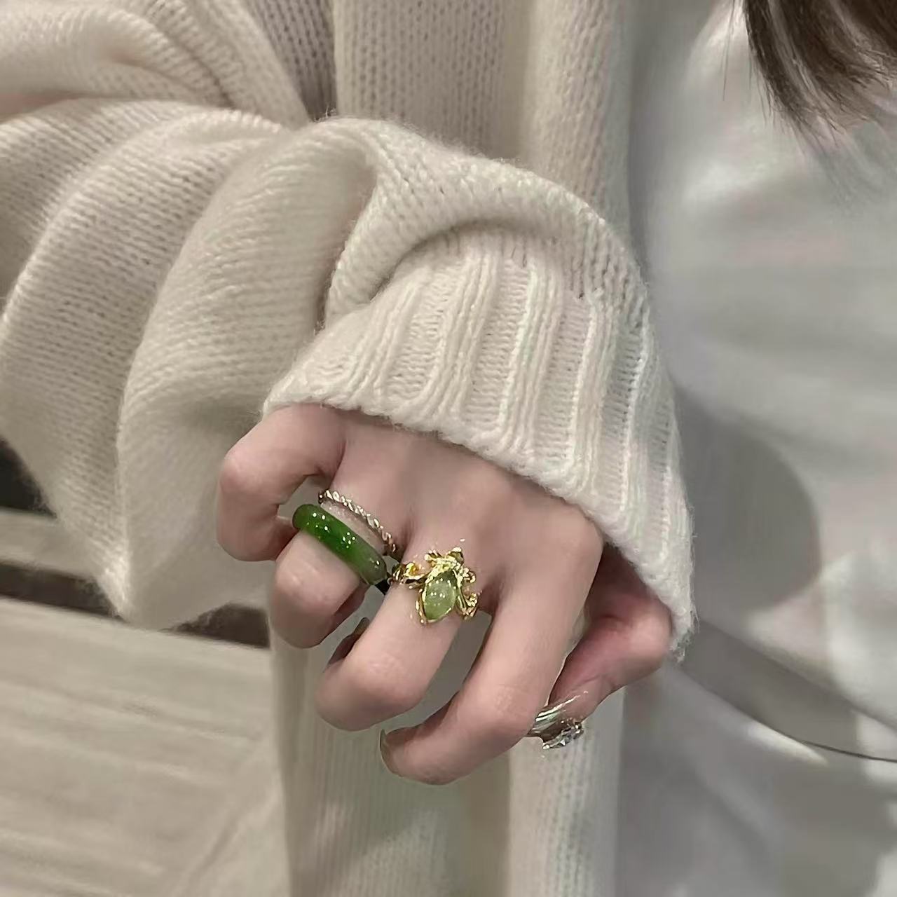 Green Plum Green Tea Niche Design White Tea Qinghuan Lychee Frozen Imitation Jade Iris Flower Ring Women's Vintage Open Ring