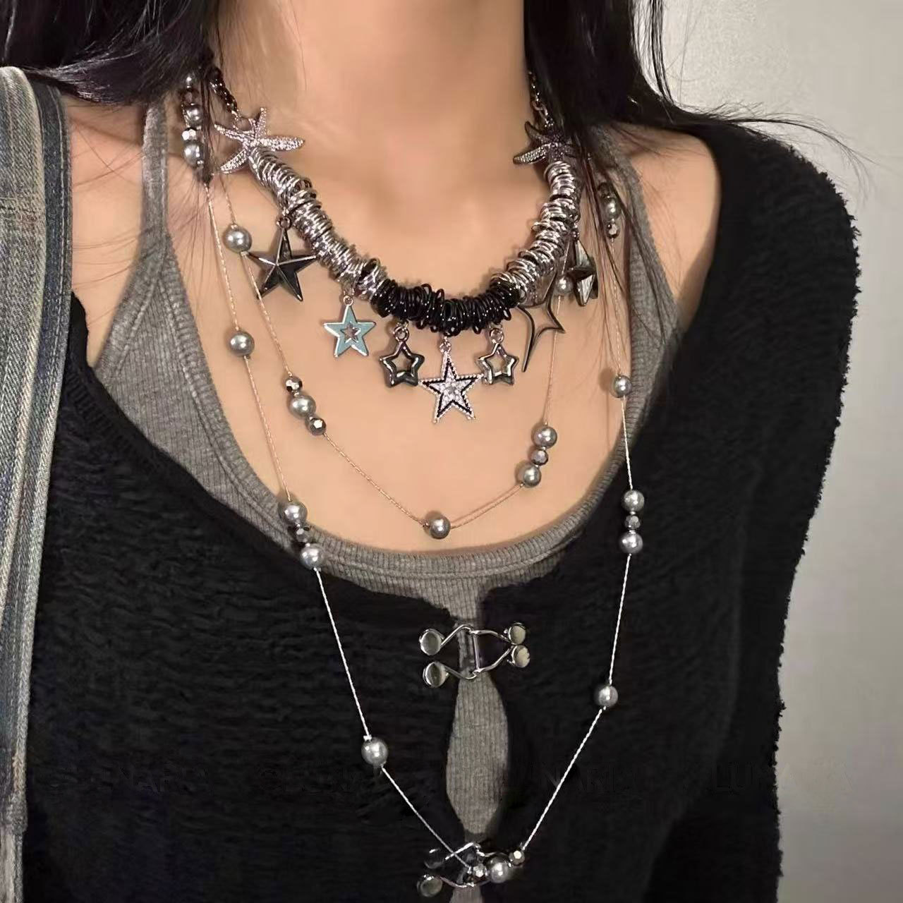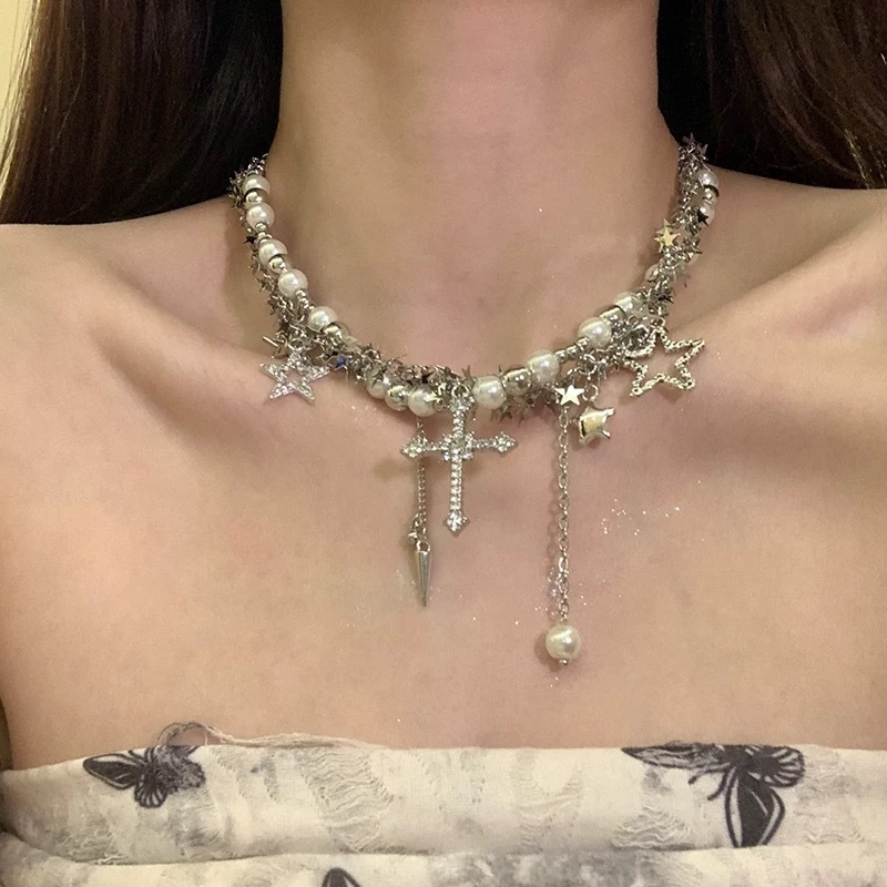 Y2K Sexy Starry Pearl Tassel Choker Clavicle Chain Niche Subculture Design Cross Exaggerated Necklace