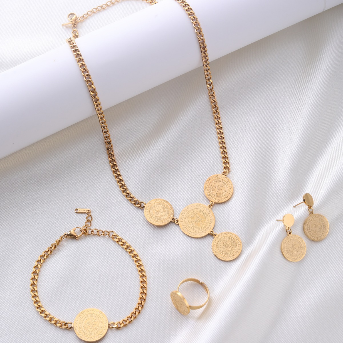 Foreign Trade Jewelry Retro Cultural Elements Pattern Titanium Steel Bracelet Earrings Ring Necklace Four-Piece Set Wholesale National Style