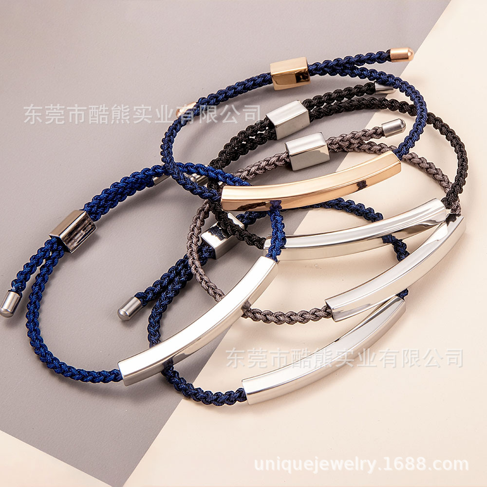 High Quality Mirror Polished Personalized Engraving Text Couple Stainless Steel Elbow Adjustable Braided Rope Bracelet