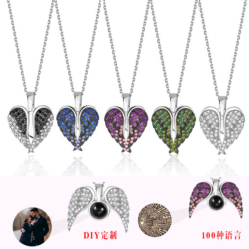 Cross-border New Love Angel Wings Necklace Color Zircon Photo Projection 100 I Love Your Language Necklace Women