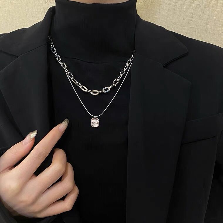 Titanium Steel Niche Design Double-layer Square Brand Pendant Necklace Women's Hip-hop Overlapped Clavicle Chain Sweater Chain Accessories New Fashion