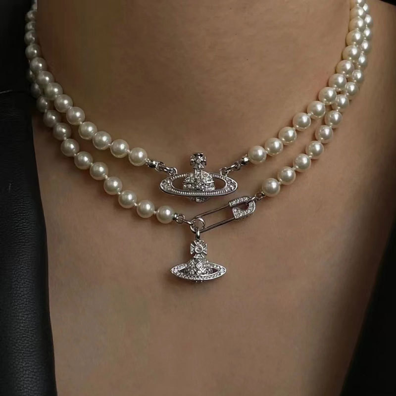 Vivian Queen Mother Saturn Round Pearl Necklace Wind Planet Pendant Vintage choker Clavicle Chain for Women