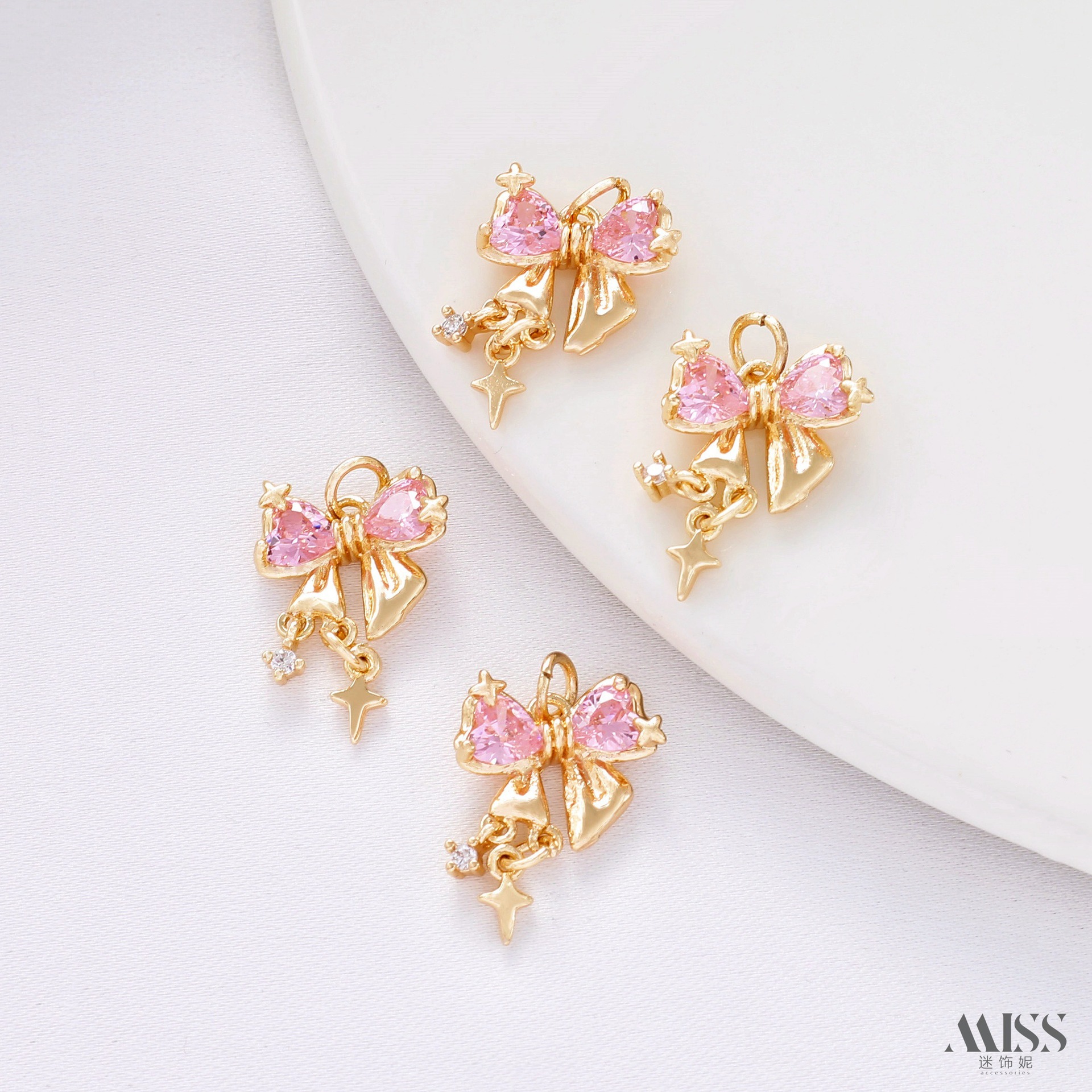 14K gold-wrapped color-retaining pink zircon bow pendant diy handmade bracelet necklace earrings pendant accessories