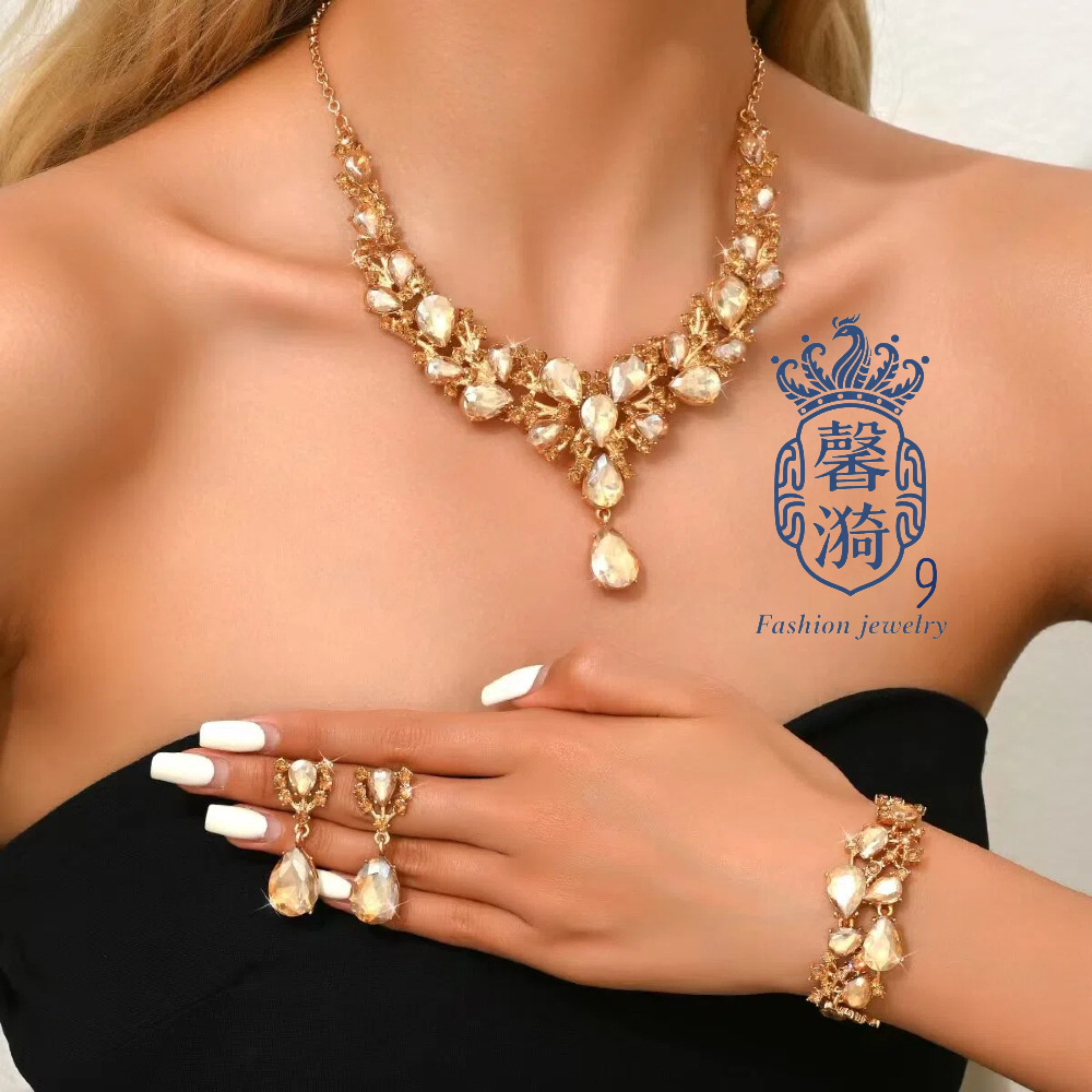 Cross-Border Amazon Water Drop Crystal Light Luxury Niche High-End Bridal Accessories Necklace Earrings Bracelet Jewelry Set