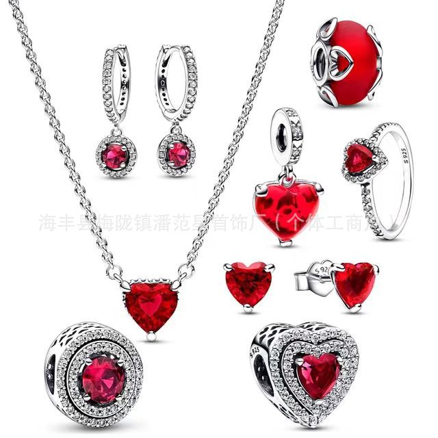 925 White Copper Silver-Plated Bracelet Beads DIY Accessories Heart Lock Cut Out Red Gemstone Beaded Necklace Set
