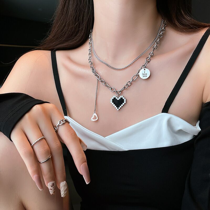 Necklace design mosaic love necklace retro Hong Kong style double-layer clavicle chain female cold style hip hop sweater chain