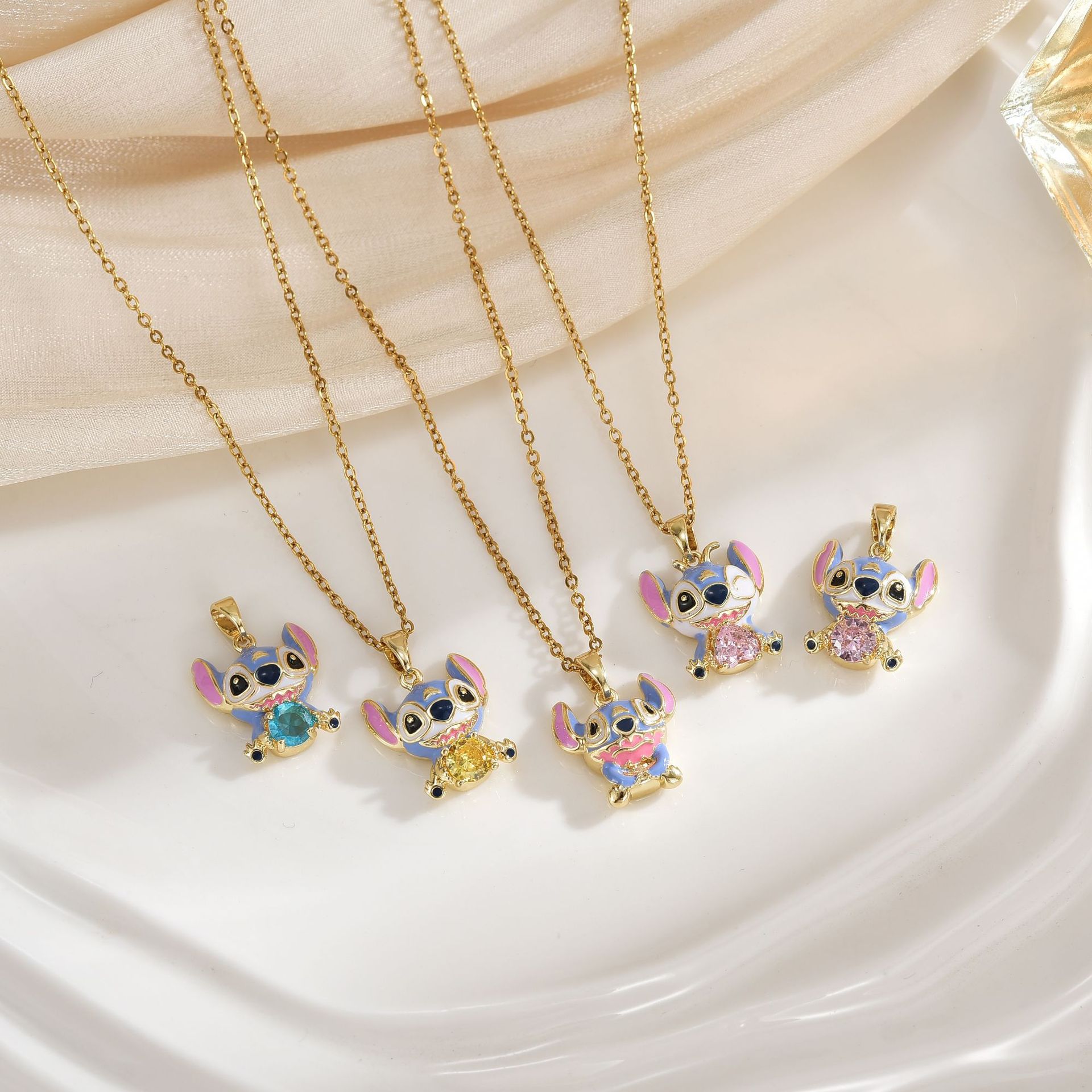 European and American Cross-Border Cartoon Cute Stitch Labubu Oil Dripping Micro-Paved Zircon Necklace Pendant DIY Jewelry Accessories