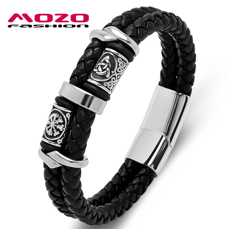 Cross-border new European and American men's double leather woven titanium steel bracelet Viking stainless steel DIY leather rope bracelet