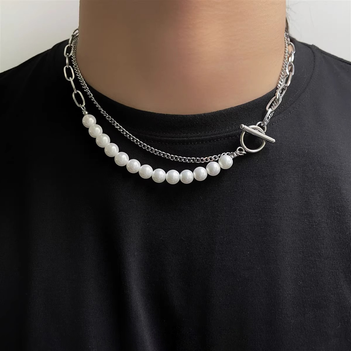 Original design double-layer Pearl stitching beaded necklace female otbuckle clavicle chain male niche neutral style necklace
