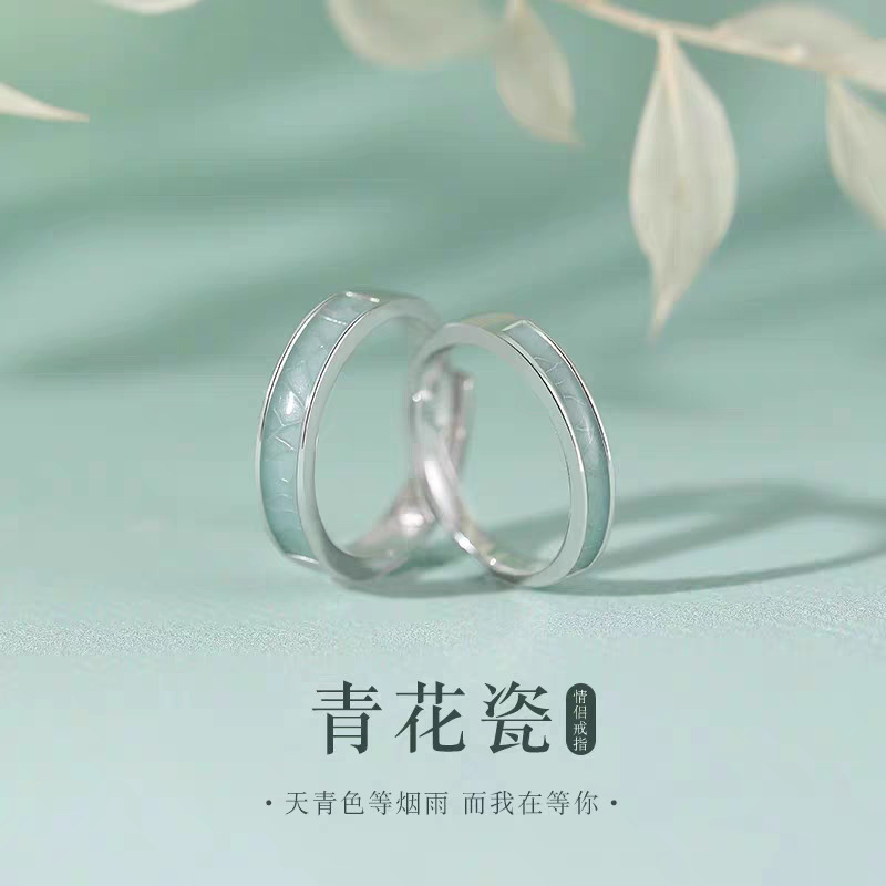 Blue and White Porcelain Couple Ring, Male and Female Couple Ring, Chinese Style Niche Accessible Luxury High-End Live Mouth Adjustable