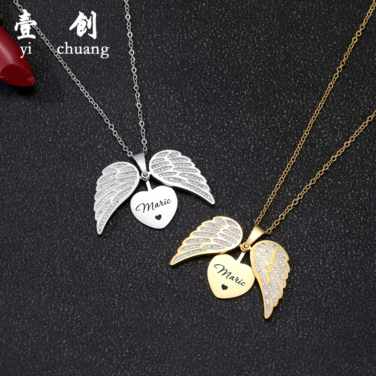 Cross-Border Brazilian Hot-Selling DIY Laser Text Letters Stainless Steel Angel Wings Full Diamond Heart-Shaped Necklace That Can Be Opened and Closed