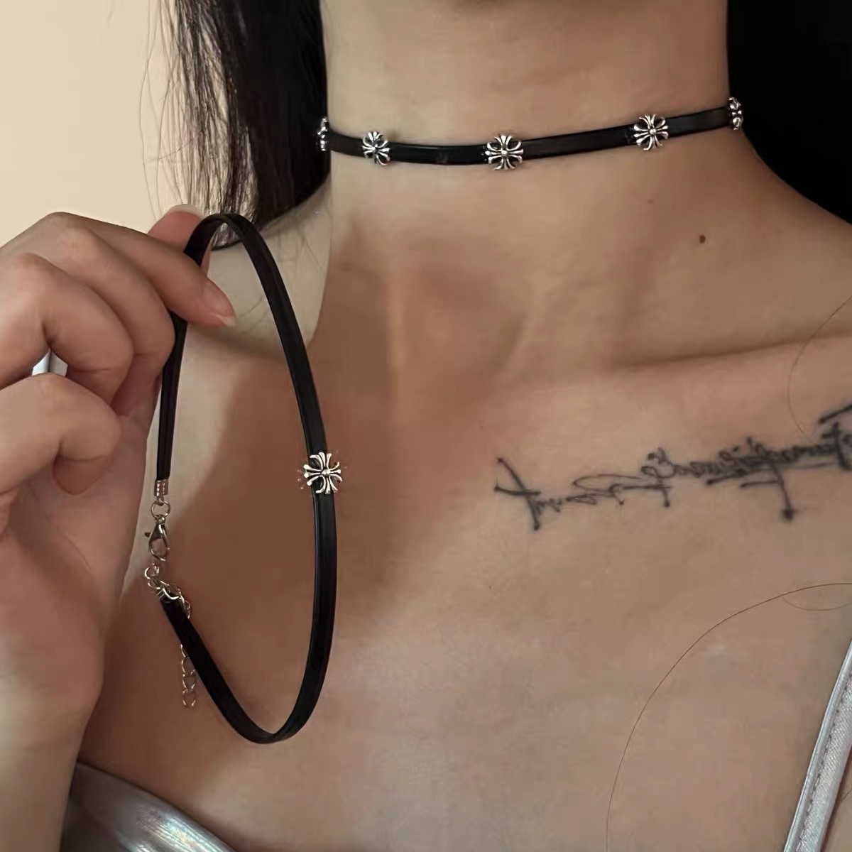 Punk Style Casual Black Leather Cross Choker Necklace Niche Design Sweet and Cool Necklace for Women Simple and Trendy