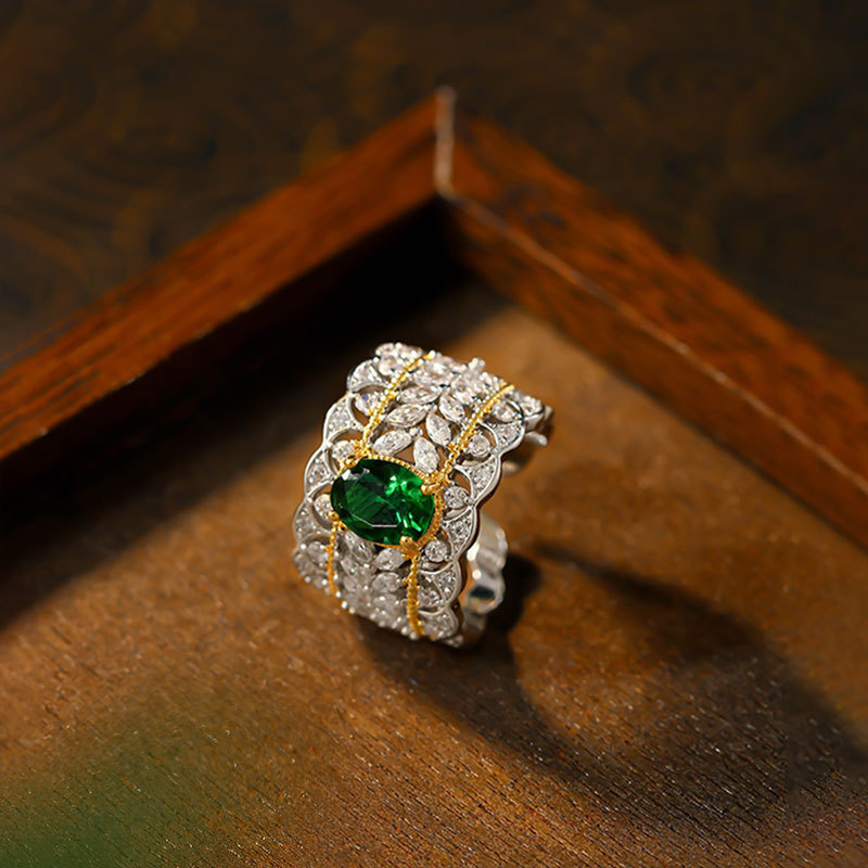 Italian Palace Hollow Pattern Double Color Gold Jewelry Lace Imitation Emerald Pigeon Egg Retro Style Ring