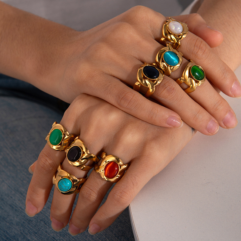 Fashion Retro Multi-color Natural Stone Titanium Steel Ring Niche High-end Hollow-out Ring Women's 18k Gold Light Luxury All-match