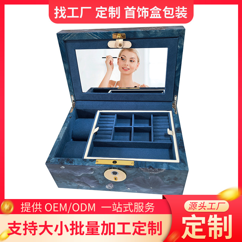 High-End Jewelry Box with Lock, Retro Chinese Style Three-Gold Flip Jewelry Box, Solid Wood Jewelry Storage Box, Custom Factory