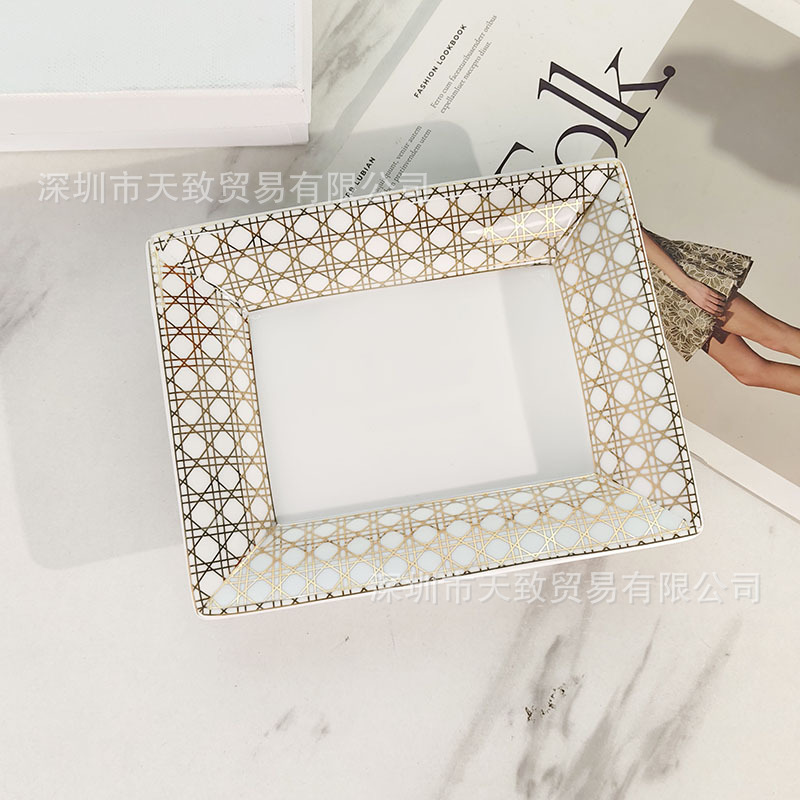 European-Style Light Luxury Gold Plaid Storage Tray Creative European-Style Bone China Storage Tray Organizer for Home Living Room Office Decoration