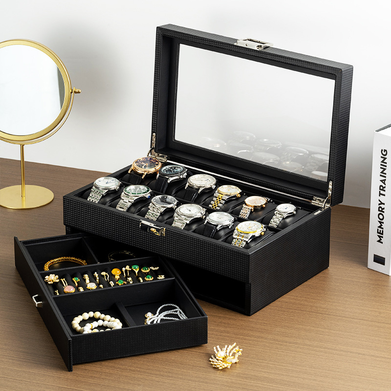 Watch Jewelry Box Double Layer 12 Table Carbon Fiber PU Jewelry Box Watch Display Box Storage Box Desktop Storage Box