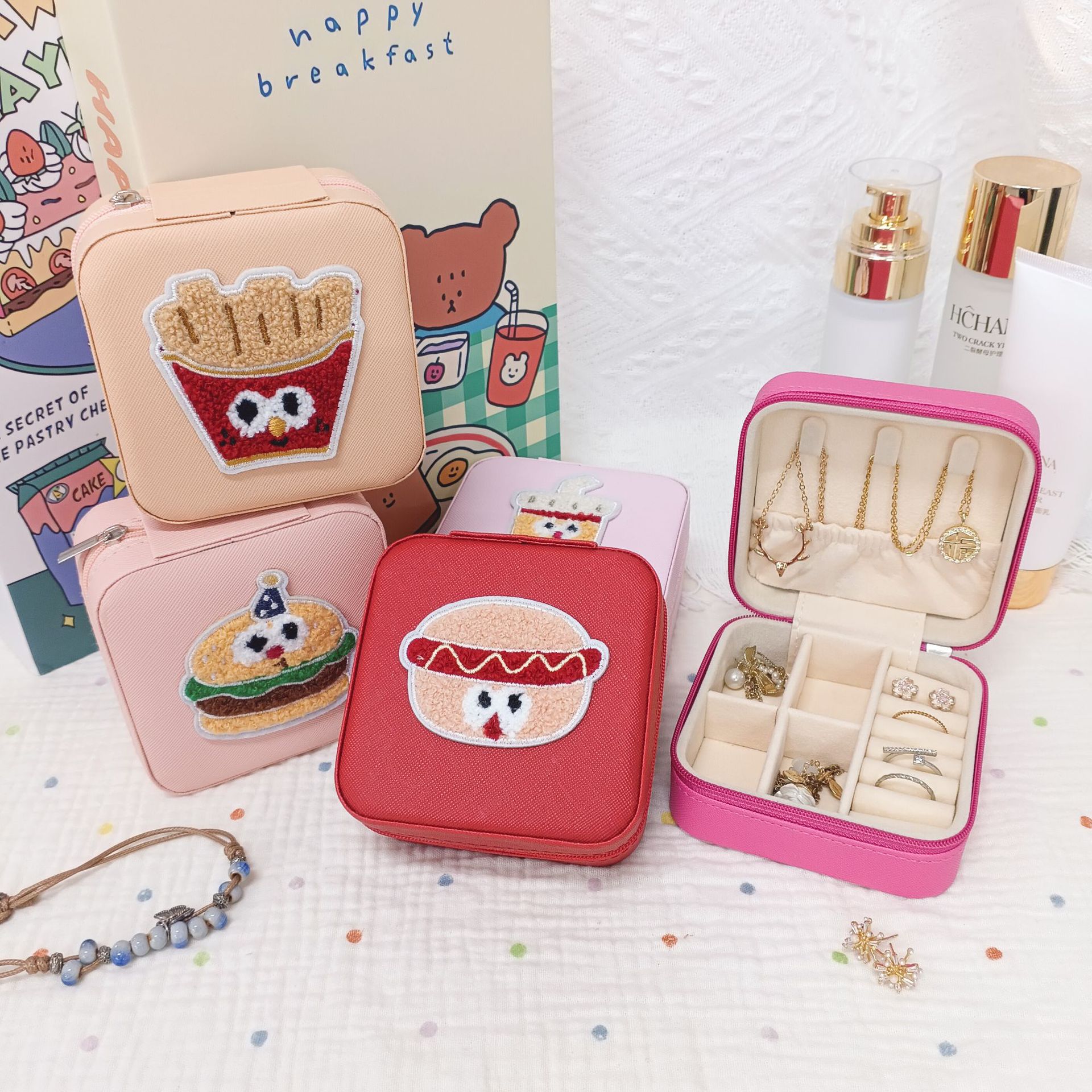 Creative Square Leather Jewelry Box, Earrings, Bracelets, Rings, Storage and Organization Box, Portable Cartoon Food Jewelry Box