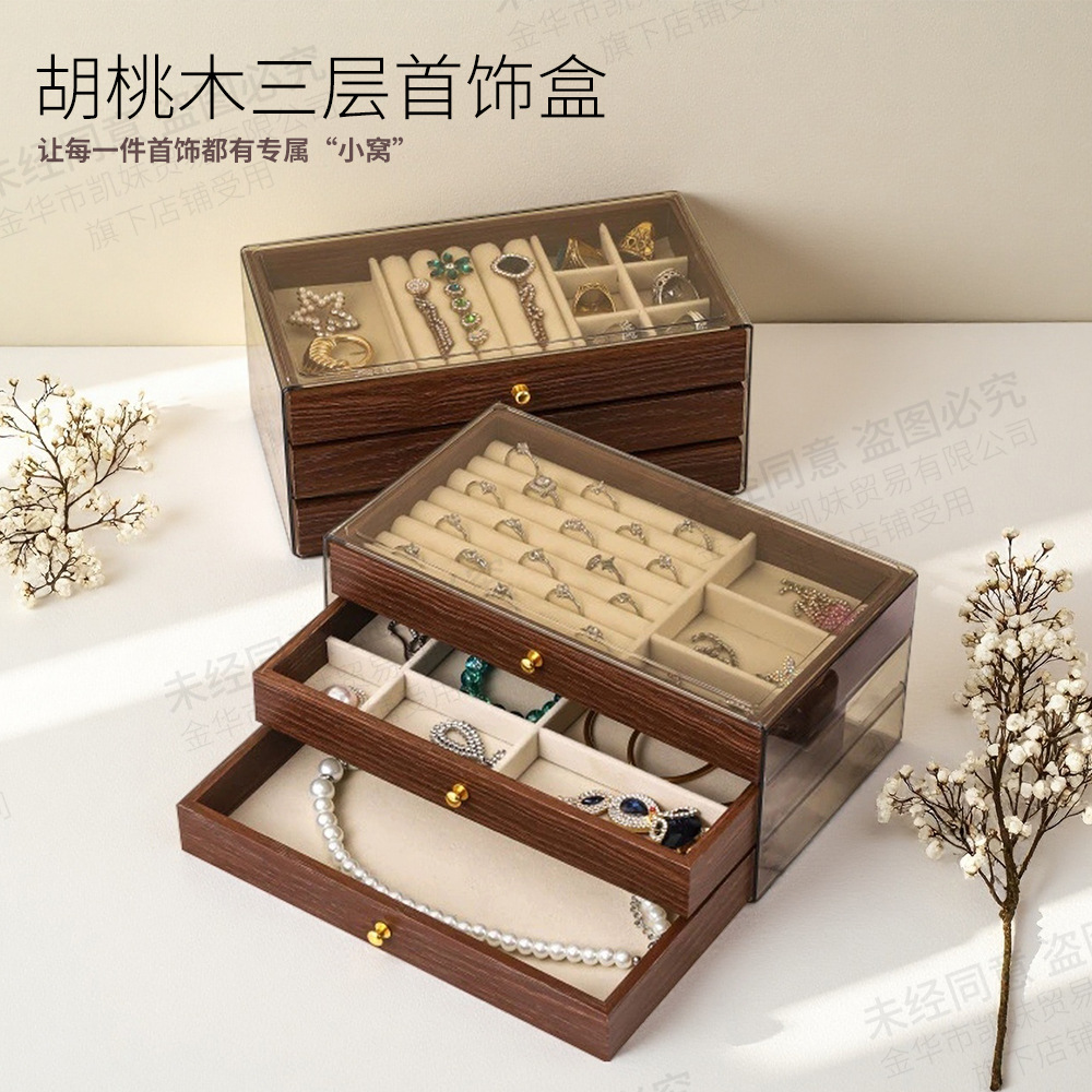 Popular European Classical High-End Walnut Grain Multi-Layer Ring Box Acrylic Pull-Out Three-Layer Jewelry Storage Box