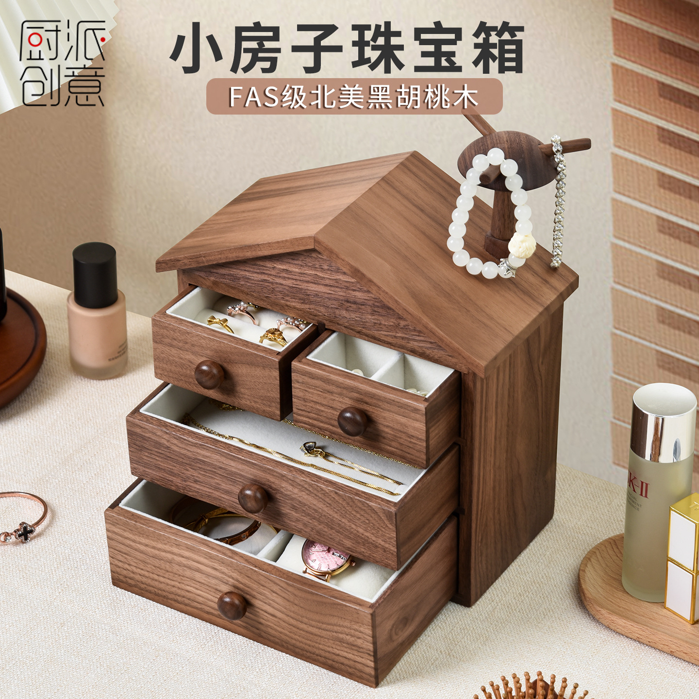 Walnut Small House Jewelry Box High-End Large-Capacity Gift Gold Jewelry Storage Solid Wood Customization Cross-Border