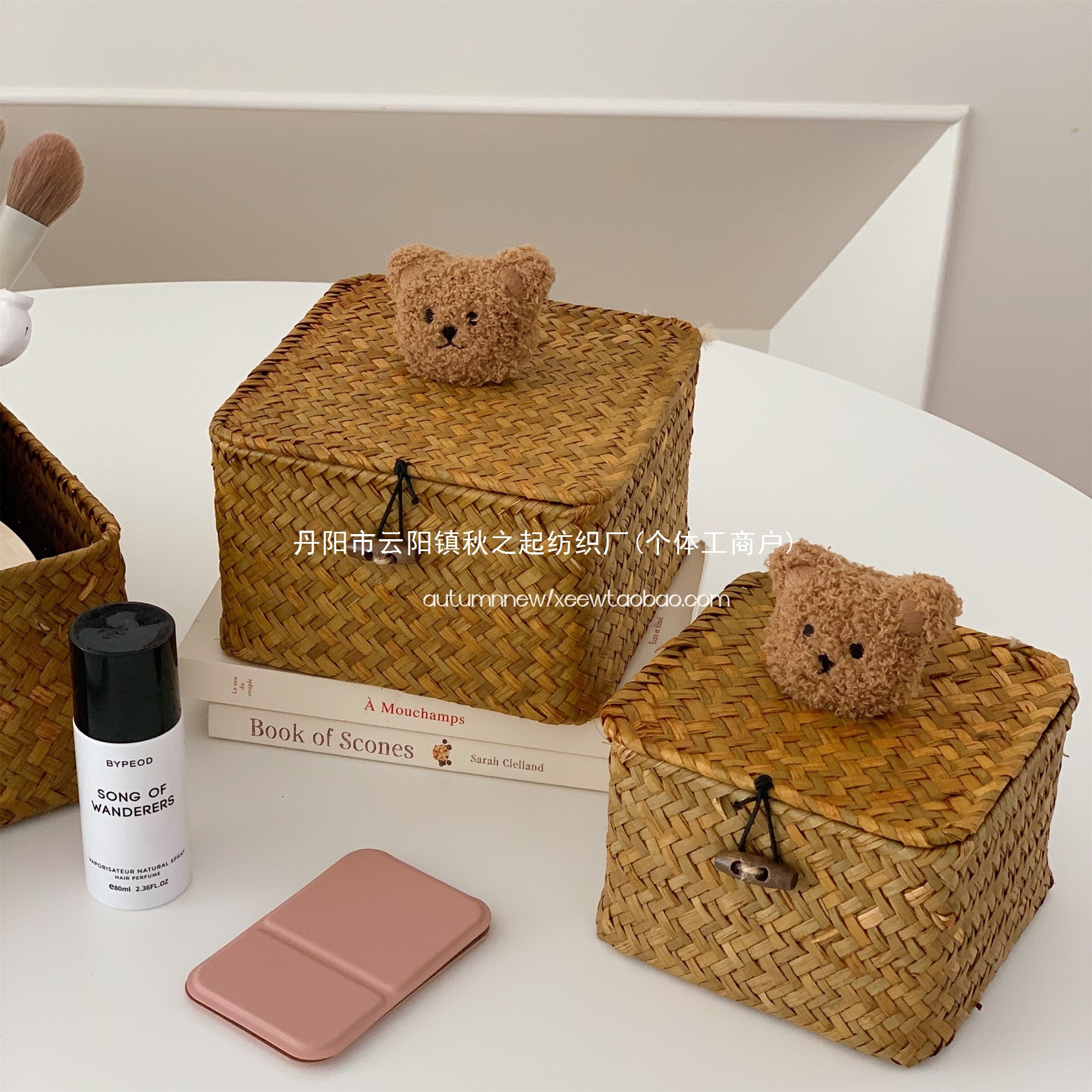 Bedside Table Storage Box Hairpin Hair Accessories Storage Basket Cute Bear Decoration Perfume Sample Flip Cover Straw Weaving Wholesale