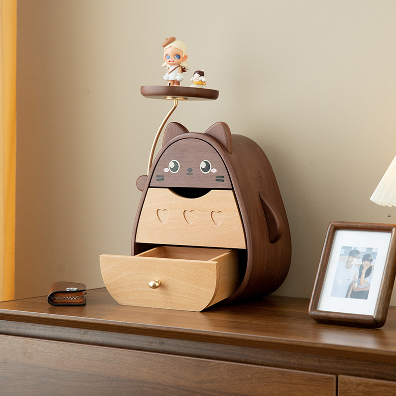 Desktop Storage Box Wooden Drawer-Type Debris Organizer Cute Cartoon Ornaments Desk Storage Rack Birthday Gift