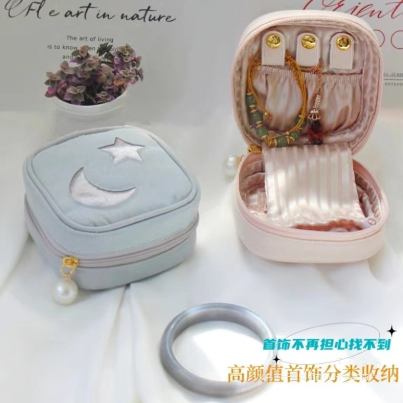 New Star and Moon Embroidered Ice Cream Pearl Square Portable Jewelry Box Fabric Storage Small Jewelry Bag Earrings Ring