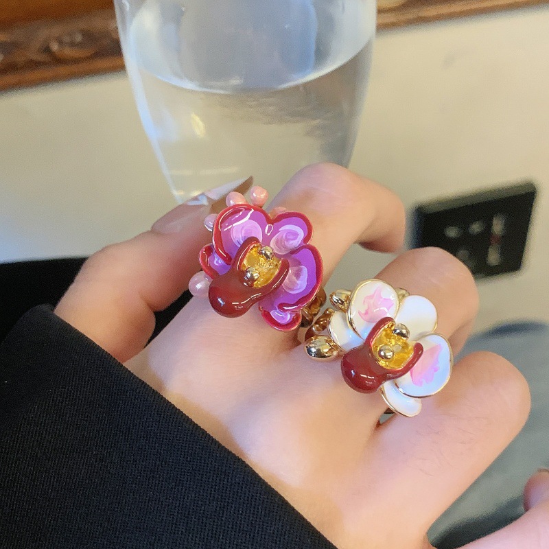 Designer Handmade Enamel Glazed Tropical Orchid Butterfly Orchid Ring Small Fragrant Retro Flower Stacking Ring