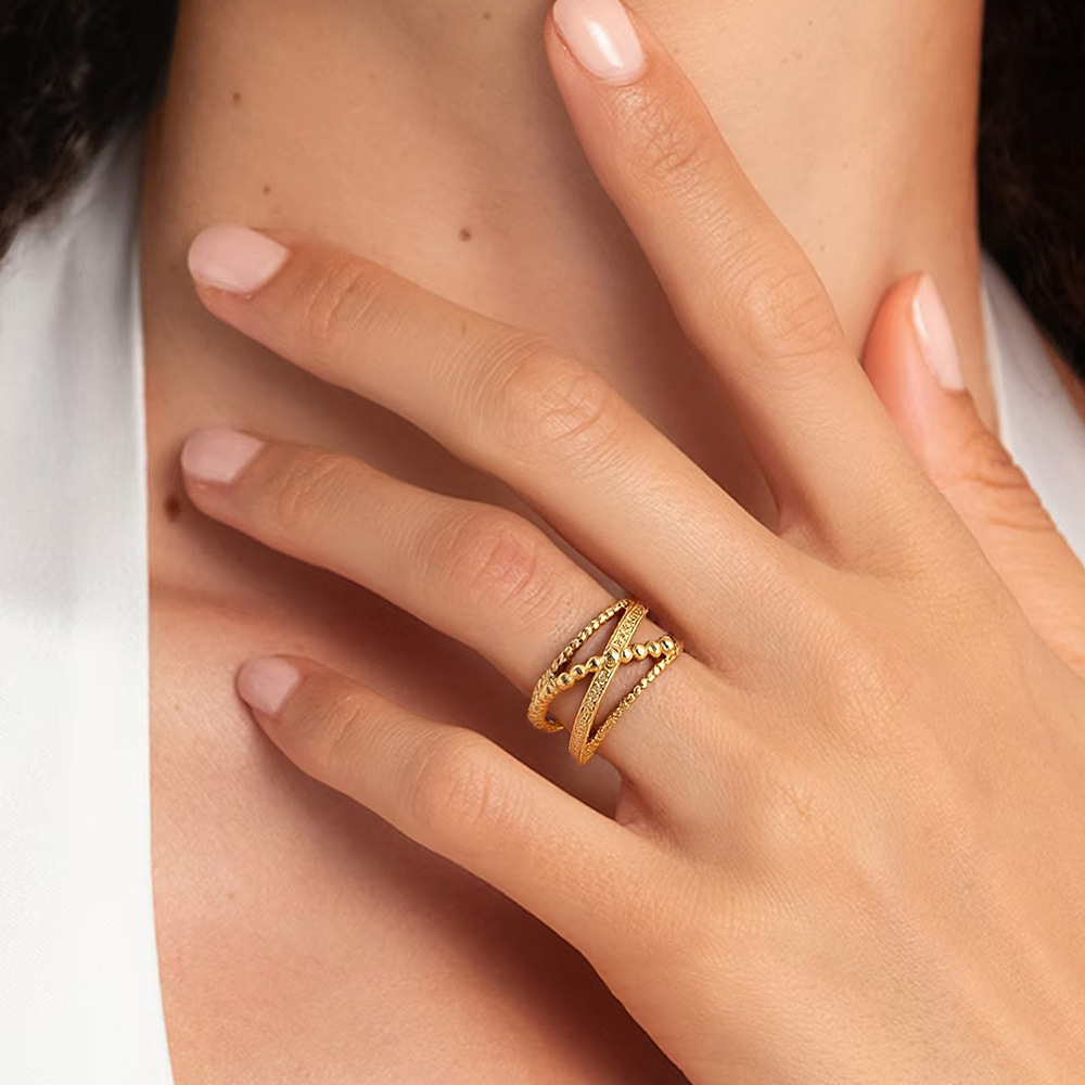 New French Style Stainless Steel Gold-Plated Women's Line Cross Ring Fashionable Design Multi-Layer Open Ring Ring