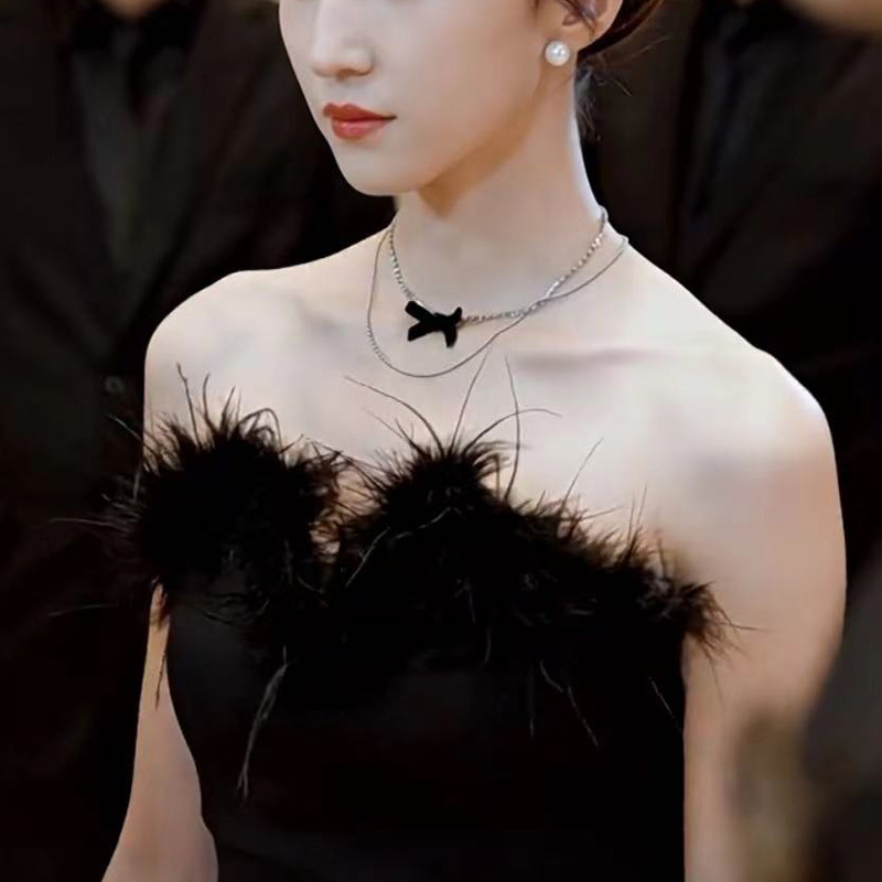 Ins Black Velvet Bow New Design Sense Double-layer Necklace Internet Popular European and American Clavicle Chain Women's All-match Girlfriend