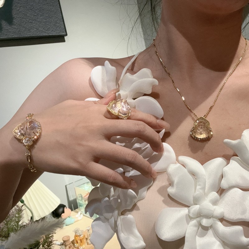 New Chinese Pink Crystal Maitreya Buddha Rose Stone Bracelet Design Sense All-match Fashion Trend Buddha Ring Necklace
