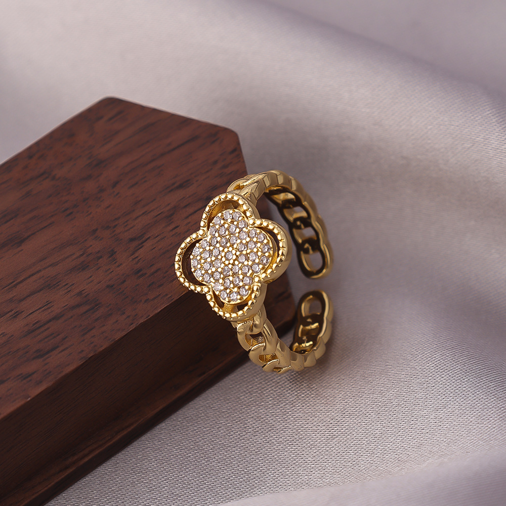 Four-Leaf Clover Full Diamond Zircon Ring for Women, Accessible Luxury, Exquisite and High-End Ins Niche Design Food Ring Open Ring